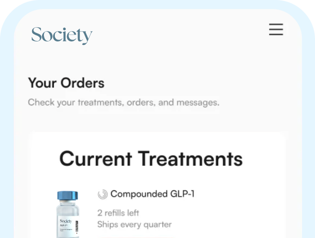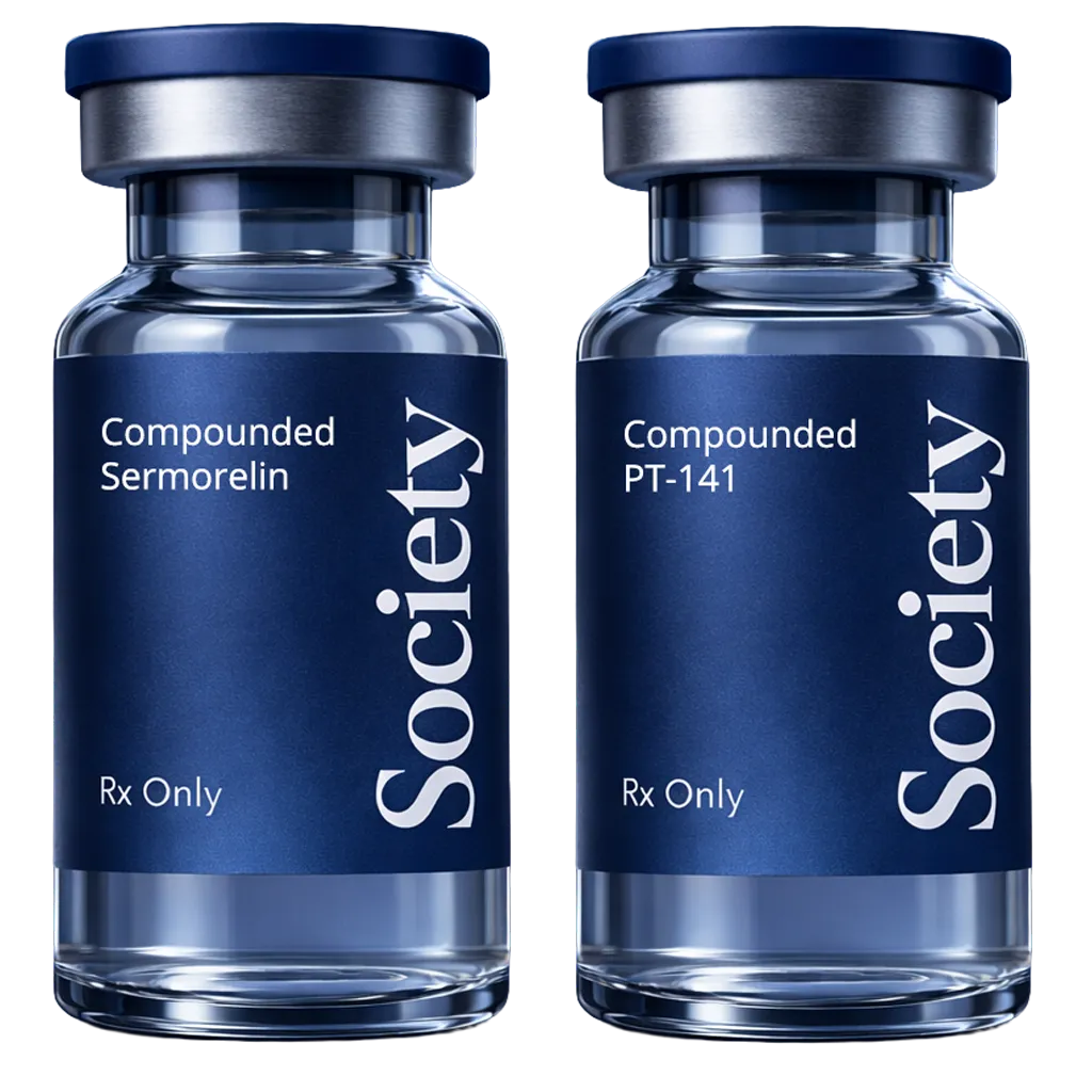 Society partners with licensed U.S. pharmacies. Certain treatments may include compounded medications, which are not FDA-approved and have not been evaluated by the Food and Drug Administration for safety, efficacy, or quality. Compounded medications may be prescribed by a healthcare provider based on individual patient needs or during periods of drug shortages. FDA-approved GLP-1 medications—such as Ozempic® (semaglutide), Wegovy® (semaglutide), and Zepbound® (tirzepatide)—are not compounded. Society is not affiliated with, endorsed by, or sponsored by the manufacturers of these products. All trademarks and brand names belong to their respective owners.